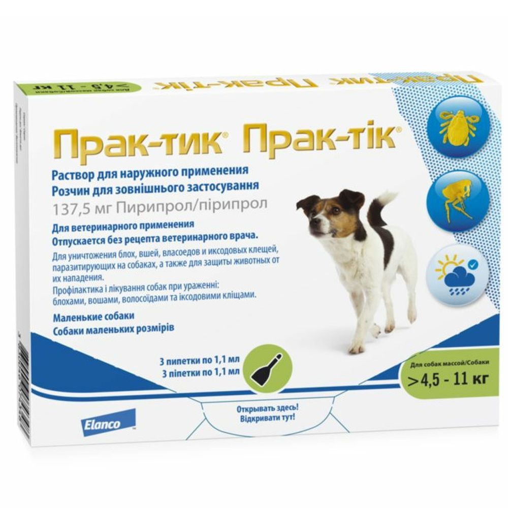 Прак- тик. Раствор для капельного нанесения на кожу для собак массой от 4,5 до 11 кг. Инсектоакарицидный лекарственный препарат, предназначенный для борьбы с насекомыми и иксодовыми клещами, паразитирующими на собаках, а также защиты животных от их нападения.