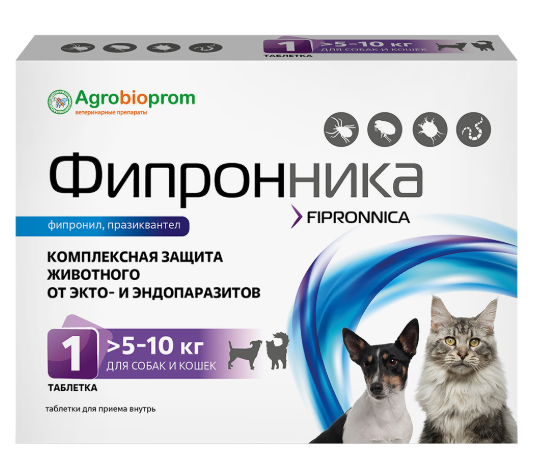 Лекарственный препарат Фипронника для собак и кошек массой 5-10 кг содержит в 1 таблетке в качестве действующих веществ: фипронил - 15 мг, празиквантел - 50 мг.