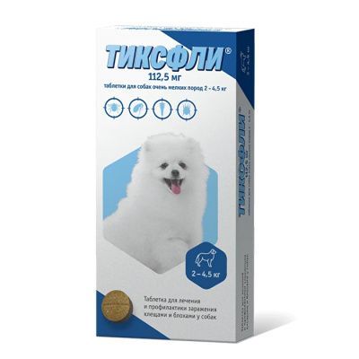 Тиксфли (Tiksfli) 112,5 мг - таблетки от блох и клещей для собак очень мелких пород 2-4,5 кг. Препарат представляет собой таблетки плоскоцилиндрической формы от светло-коричневого до темно-коричневого цвета, допускается наличие вкраплений, с риской на одной стороне и цифрами содержания активнодействующего вещества на другой. -