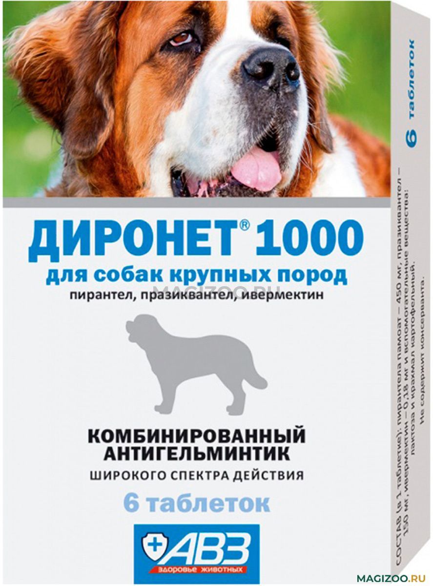Состав: Диронет® 1000 предназначен для собак крупных пород, содержит в одной таблетке пирантела памоат 450 мг, празиквантела 150 мг и ивермектина 0,18 мг. Доза - 1 таблетка на 30 кг массы тела животного.