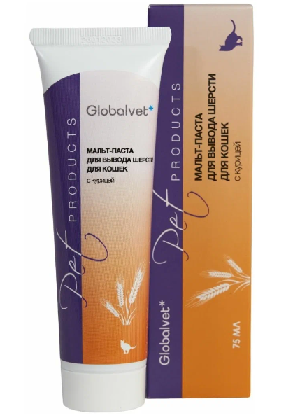 Мальт-паста для кошек Globalvet - гигиеническое средство для естественного очищения желудочно-кишечного тракта от шерсти, проглоченной после вылизывания. Представляет собой пасту темно-коричневого цвета. Солод, входящий в состав пасты, смягчает волосяные комки и способствует их выведению естественным путем. Таурин в составе пасты является источником аминокислот и поддерживает иммунитет животного.