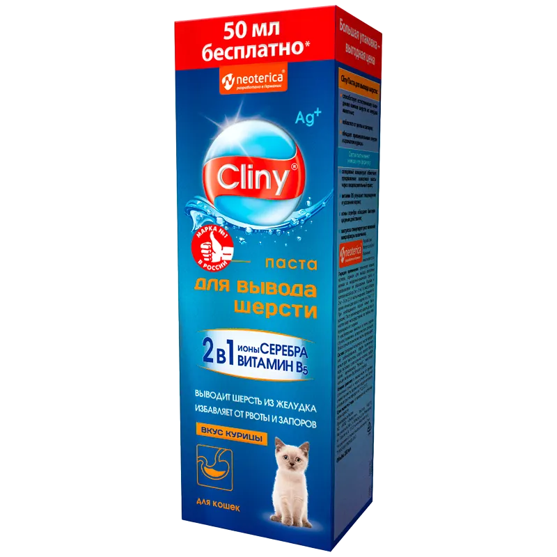Паста для вывода шерсти Cliny способствует естественному выведению комков шерсти (безоаров) из желудка животных. Избавляет кошек от рвоты, потери аппетита, закупорки кишечника, запоров. Обладает привлекательным для кошек вкусом курицы.