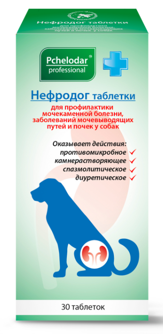 Дозы и способ применения: Нефродог применяют перорально (внутрь) индивидуально, из расчета – 1 таблетка на 10 кг массы животного, задают с небольшим количеством корма или принудительно на корень языка, в течение 10-14 дней. Курс повторяют каждые 3-4 месяца. Для предотвращения рецидивов мочекаменной болезни и урологического синдрома у собак, препарат Нефродог применяют курсами каждые 2-3 месяца. В комплексной терапии при лечении урологических заболеваний у собак курс применения препарата Нефродог устанавливает ветеринарный врач по показаниям. Допускается изменение длительности курса применения препарата по рекомендации, лечащего ветеринарного врача индивидуально для данного животного. При пропуске одного или нескольких приемов препарата, его применение возобновляют в тех же дозах и по той же схеме. Симптомы передозировки у животных не выявлены. Особенностей действия лекарственного препарата при первом приеме и отмене не установлено. Применение Нефродога не исключает использование других этиотропных и патогенетических лекарственных средств. Препарат совместим с лекарственными средствами и кормовыми добавками. Применять препарат только по назначению.