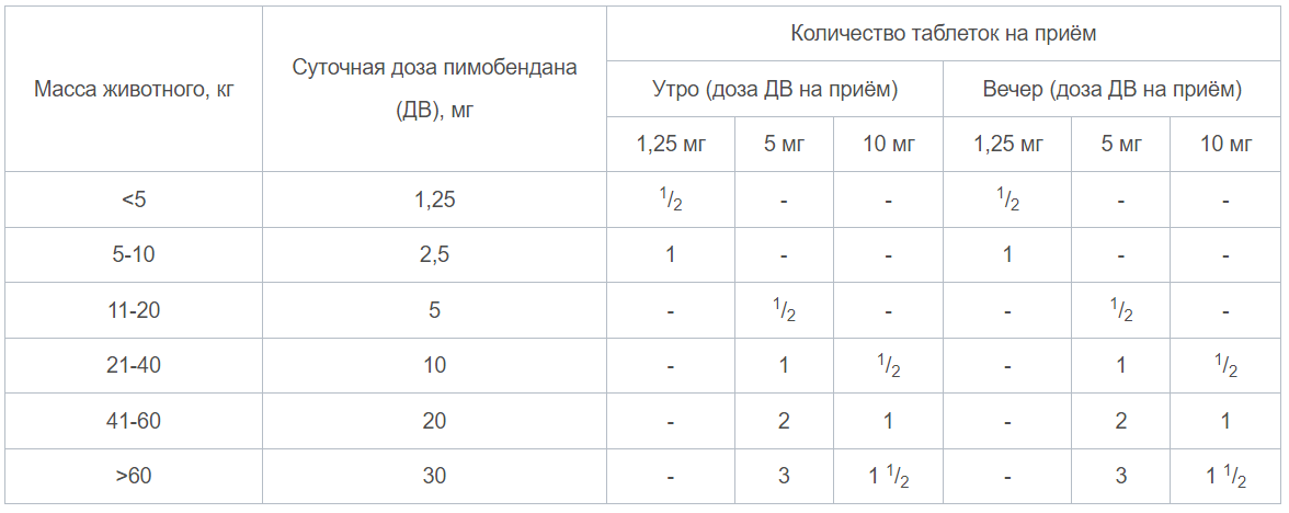 Суточная доза пимобендана (действующего вещества) составляет от 0,2 мг до 0,6 мг на 1 кг массы животного и делится на два приема. Рекомендованная доза для достижения клинического эффекта - 0,5 мг/кг массы животного в сутки.
