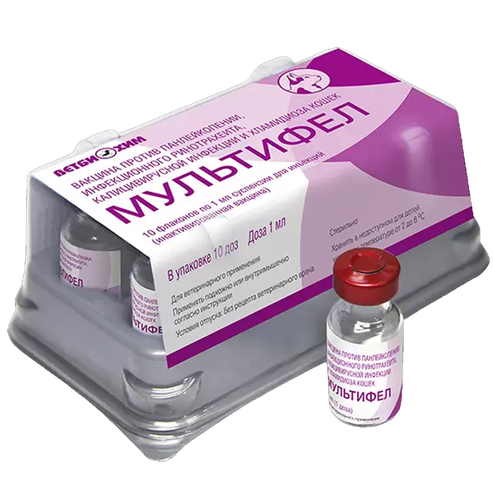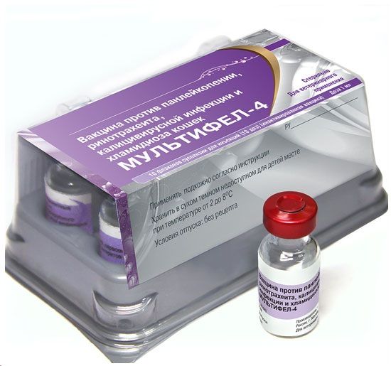Мультифел- 4. Вакцина против панлейкопении, ринотрахеита, калицивирусной инфекции и хламидиоза кошек. Вакцина является безопасным и высокоэффективным средством специфической профилактики наиболее опасных инфекционных болезней кошек.