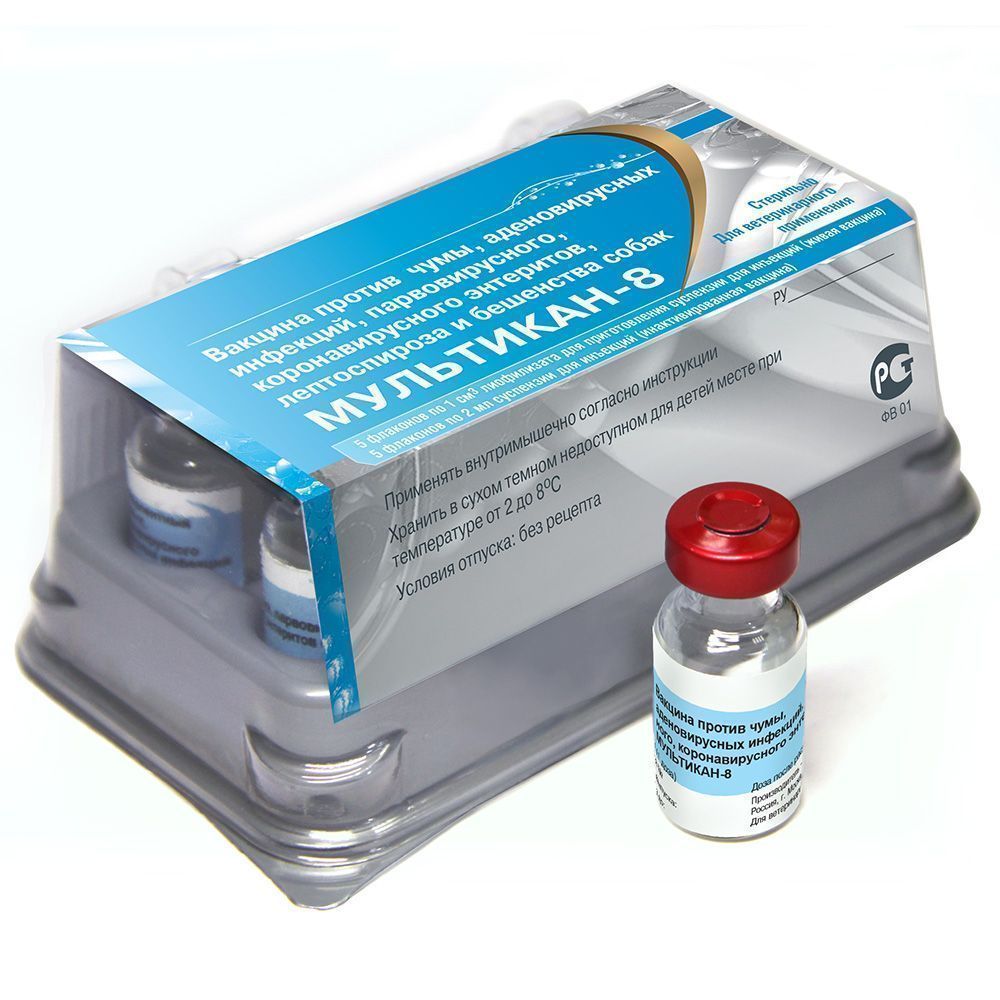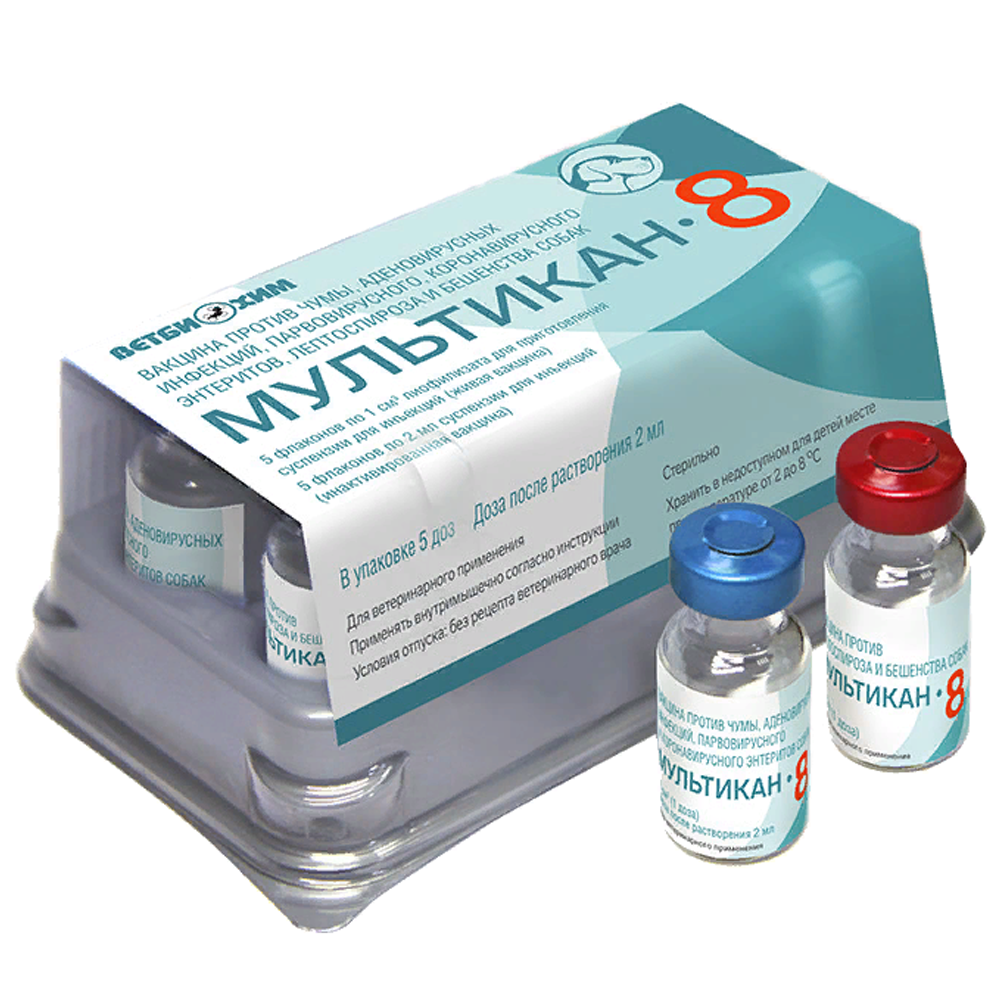 Мультикан- 8. Вакцина против чумы, аденовирусных инфекций, парвовирусного и коронавирусного энтеритов, лептоспироза и бешенства собак. Вакцина является безопасным и высокоэффективным средством специфической профилактики чумы, аденовирусных инфекций, парвовирусного и коронавирусного энтеритов, а также лептоспироза и бешенства собак.