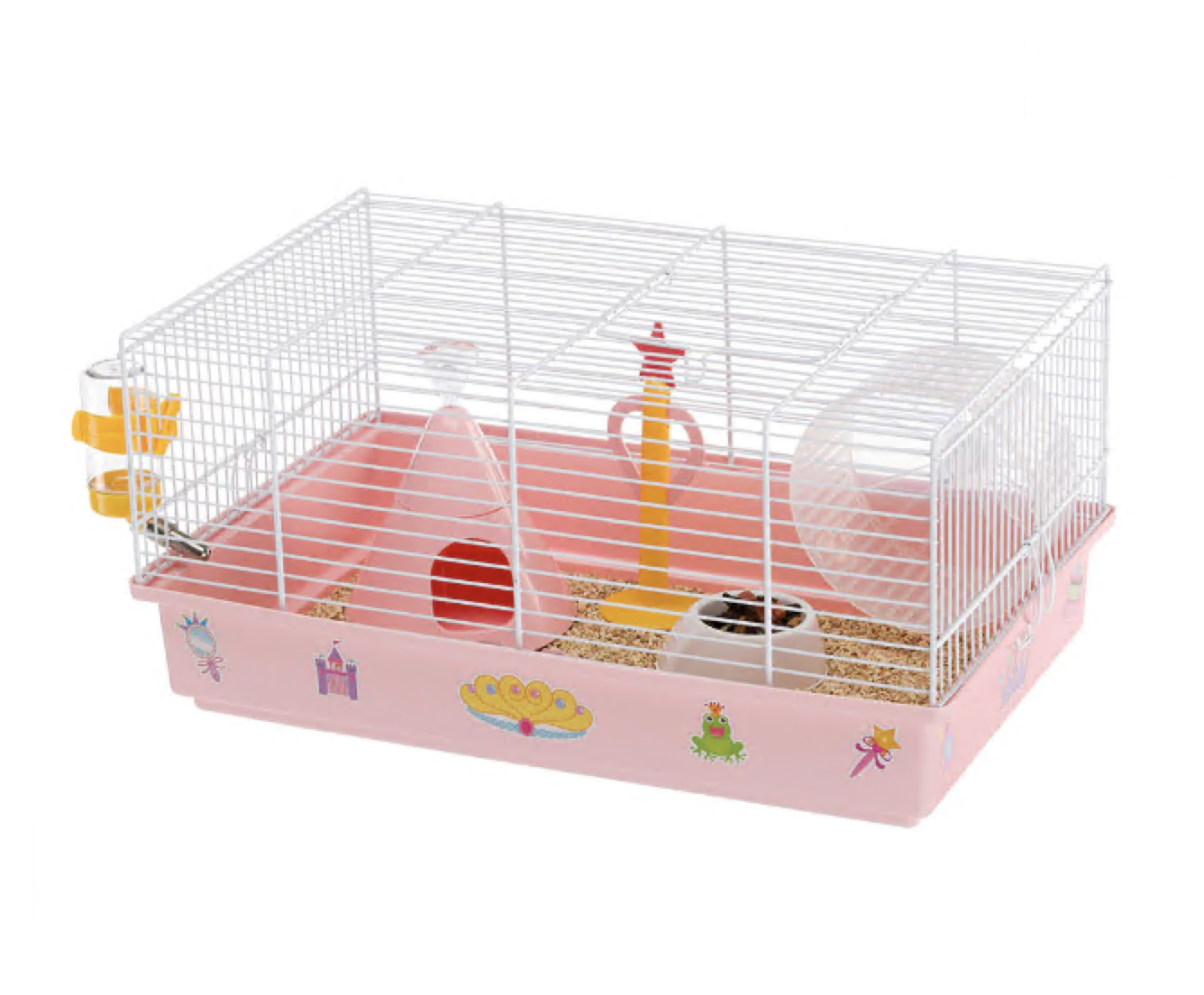Клетка поставляется в комплекте с аксессуарами: домиком для хомяка, кормушкой, поилкой и колесом, необходимым для ежедневных физических упражнений и поддержания формы. Оригинальное украшение в форме волшебной палочки – специальный подарок для маленьких принцесс - завершает внутреннее оформление клетки.