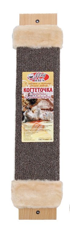 Когтеточка изготовлена из материала дсп, обернутая ковролином. Пропитана привлекающим кошку веществом, чтобы быстро приучить её точить коготки в строго определённом месте. Положите когтеточку на пол или прикрепите шурупами к стене.