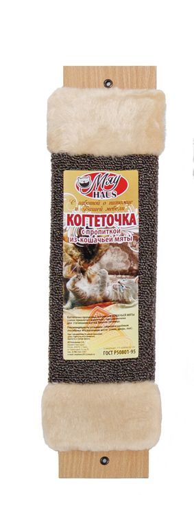 Когтеточка изготовлена из материала дсп, обернутая ковролином. Пропитана привлекающим кошку веществом, чтобы быстро приучить её точить коготки в строго определённом месте. Положите когтеточку на пол или прикрепите шурупами к стене.