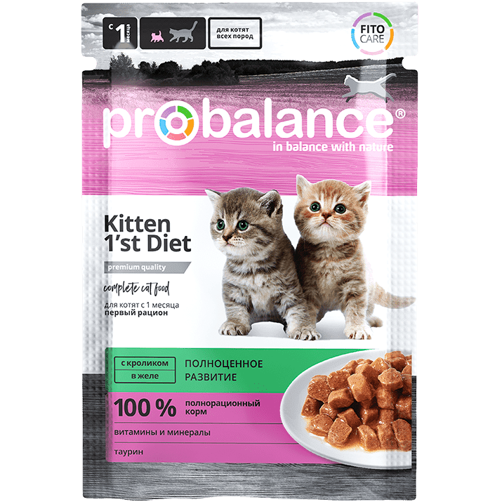 Рацион рекомендован для ежедневного кормления котят с 2-х месяцев, а также беременных и кормящих кошек. В состав консервированного корма ProBalance "Kitten 1`st diet" входит кролик, который считается диетическим мясом. Это источник железа, меди, витаминов и микроэлементов, которые необходимы для полноценного развития и роста котенка. Природные антиоксиданты, содержащиеся в кусочках мяса, способствуют укреплению иммунитета.