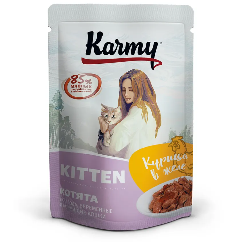 Karmy Kitten - это порция аппетитных кусочков в ароматном желе, приготовленных с учетом индивидуальных потребностей котят до 1 года, а также беременных и кормящих кошек. В составе корма только натуральные ингредиенты, а также все необходимые микроэлементы и витамины для здорового роста и развития вашего любимца.