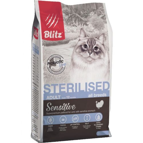 Сбалансированный сухой корм с индейкой для стерилизованных кошек Blitz Sterilised Cats - яркий представитель класса супер-премиум: он обладает великолепным вкусом и обеспечивает оптимальный баланс питательных веществ для кастрированных котов и стерилизованных кошек. Сниженное содержание жира, оптимальное содержание клетчатки и L-карнитин препятствует набору лишнего веса.