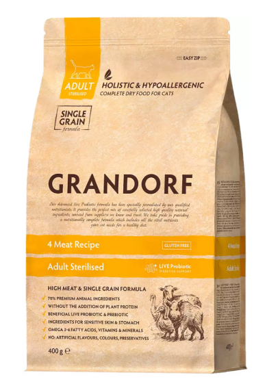 - Все корма Grandorf основаны на мясе и содержат только высококачественные животные белки. Животный белок очень ценен и содержит все незаменимые аминокислоты для вашего питомца и полностью удовлетворит его биологические потребности в мясном питании.