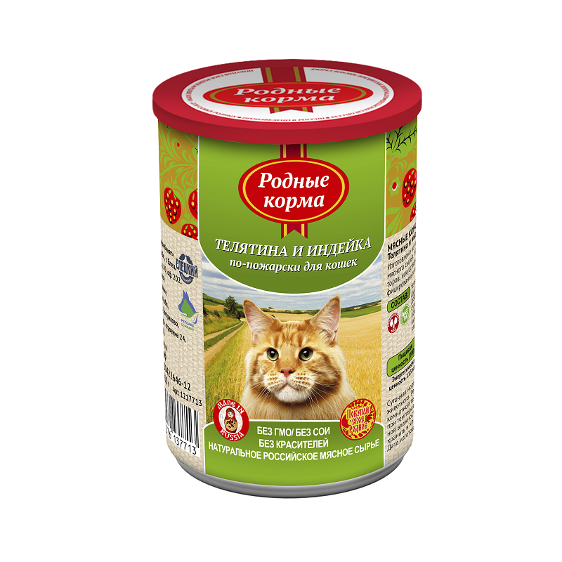 Корм для кошек Родные корма телятина с индейкой по-пожарски конс. 410 г ж/б**