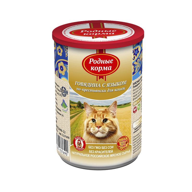 Корм для кошек Родные корма говядина с языком по-крестьянски конс. 410 г ж/б**