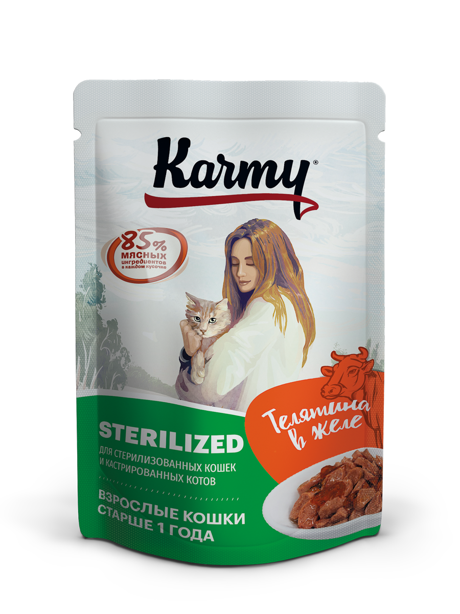 Karmy Sterilized - это порция сочных мясных кусочков в аппетитном желе, приготовленных с учетом особых потребностей стерилизованных кошек и кастрированных котов всех пород старше 1 года. В составе корма только натуральные ингредиенты, а также все необходимые микроэлементы и витамины для сохранения идеального веса и здоровья мочевыделительной системы.