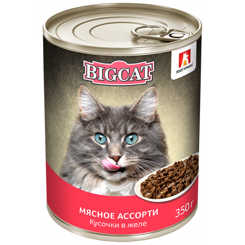 Корм для кошек Зоогурман Big Cat Биг Кэт мясное ассорти кусочки в желе конс. 350 г ж/б**