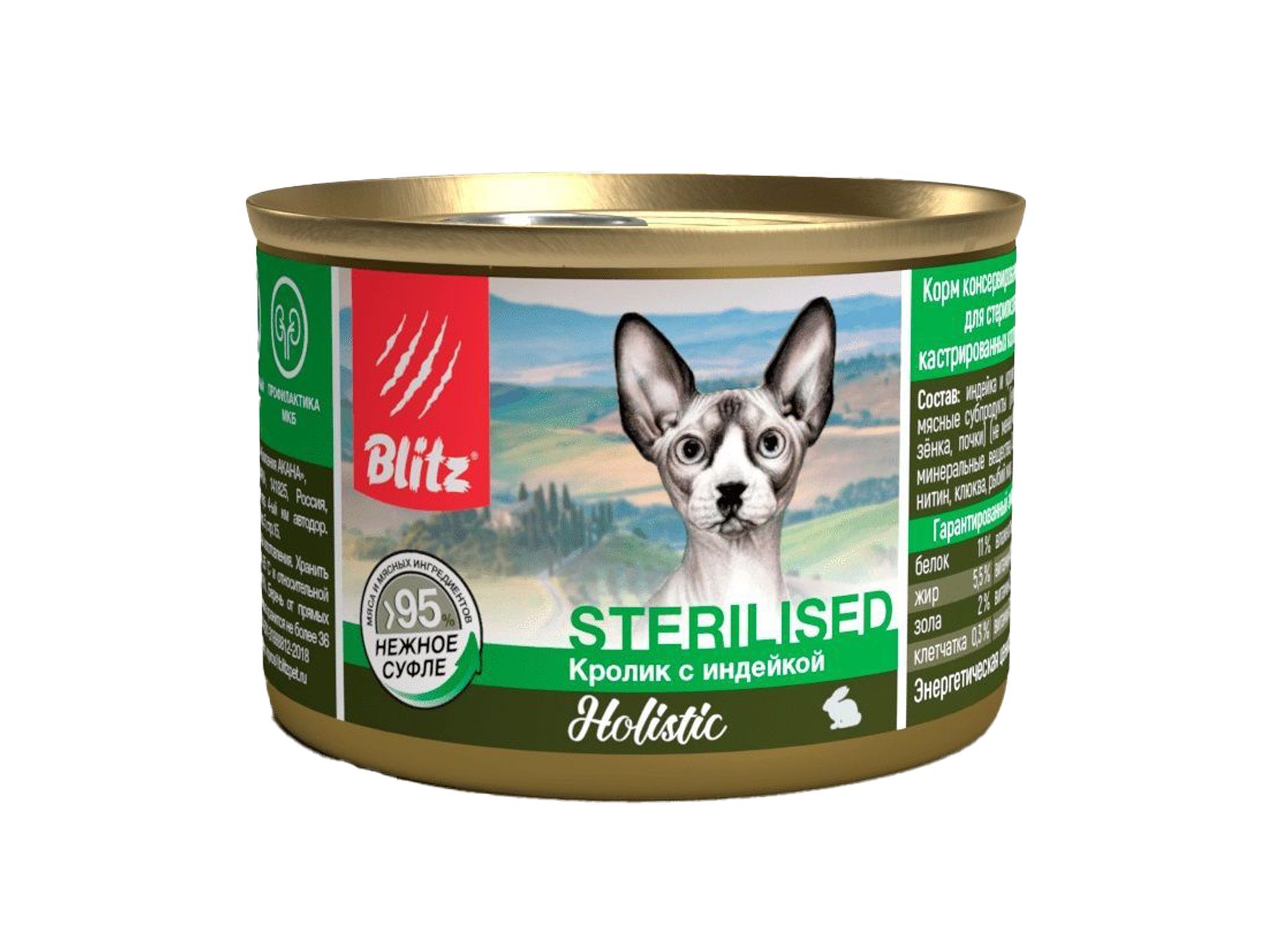 Корм для кошек Blitz Holistic Sterilised Блиц Холистик для стерилизованных кролик с индейкой суфле конс. 200 г ж/б**