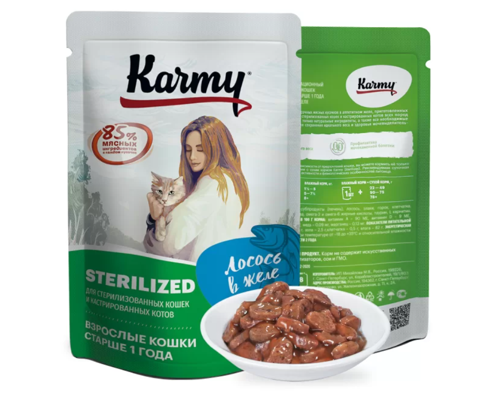 Karmy Sterilized - это порция сочных мясных кусочков в аппетитном желе, приготовленных с учетом особых потребностей стерилизованных кошек и кастрированных котов всех пород старше 1 года. В составе корма только натуральные ингредиенты, а также все необходимые микроэлементы и витамины для сохранения идеального веса и здоровья мочевыделительной системы.