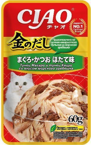 Корм для кошек Inaba Kinnodashi Инаба с тунцом Магуро и тунцом Кацуо со вкусом морского гребешка в желе 60 г пауч**