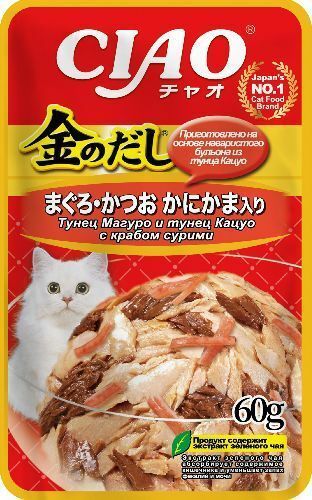 Корм для кошек Inaba Kinnodashi Инаба тунец Магуро и тунец Кацуо с крабом сурими в желе 60 г пауч**