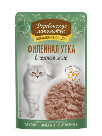 Консервированный влажный корм для кошек серии «Деревенские лакомства — Домашние обеды» — деликатес, созданный на основе отборного утиного филе, приготовленного на пару.