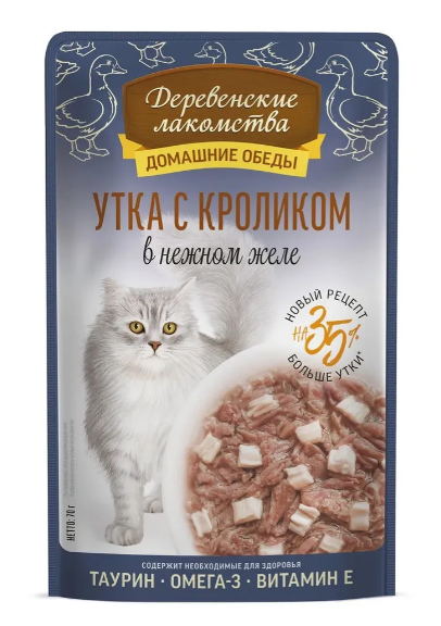 Отборное филе утиной грудки гармонично соседствует с диетическим мясом кролика, создавая неповторимый дуэт, который радует как гурманов, так и ценителей полезного питания. Каждый кусочек, покрытый нежным желе, гарантирует наслаждение для вашей кошки.