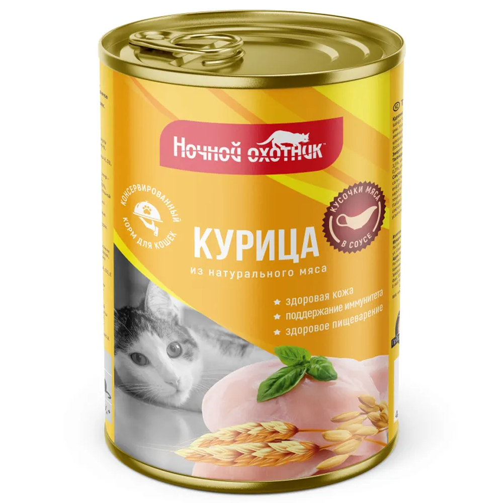 Корм для кошек Ночной охотник курица кусочки мяса в соусе конс. 415 г ж/б**