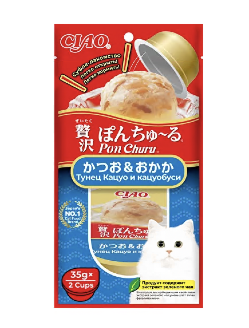 Лакомство для кошек INABA Ciao Pon Churu Инаба Суфле тунец Кацуо и кацуобуси 2 шт./35 г**