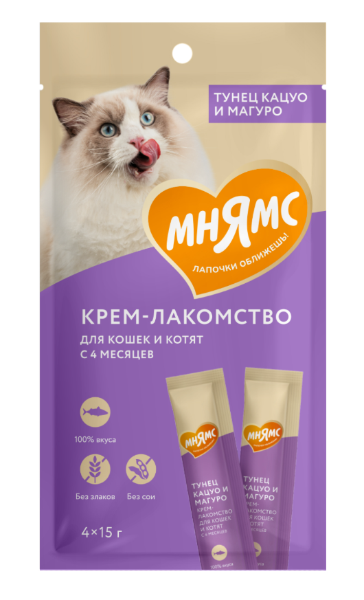 Крем-лакомство «Мнямс» с тунцом – это изысканное угощение с нежнейшей кремовой консистенцией. Утонченный вкус приводит кошек в восторг, а яркие эмоции довольных любимцев при кормлении с рук дарят хозяевам ощущение полного счастья.