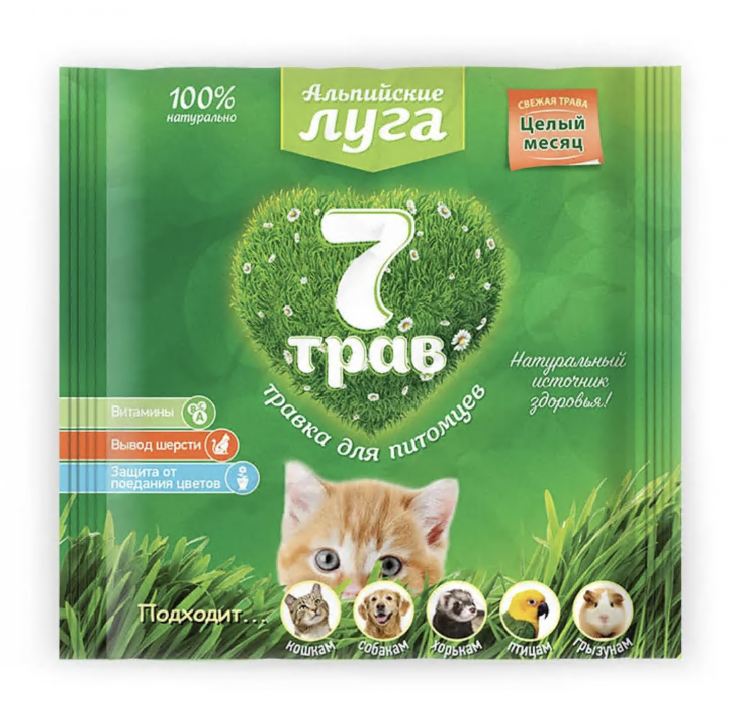 "Альпийские Луга 7 трав" содержит специально подобранные травы из 7 видов растений, которые нормализуют обменные процессы в организме животного, в том числе пищеварительные, являются естественным источником клетчатки, углеводов, витаминов группы В, витаминов Е, Н, РР, минералов, незаменимых жирных кислот, каротина; стимулируют процессы очищения желудка от шерсти.