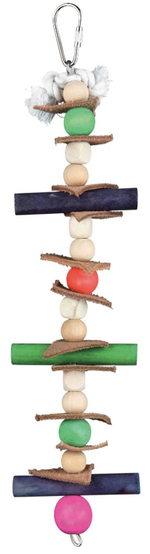 Подвесная игрушка в клетку. Выполнена из кожи и бусин, подвешенных на веревке. Состоит из скрепленных между собой деревянных и кожаных элементов и кусочков хлопковой веревки. Игрушка фиксируется металлическим карабином с резьбой. Подвешивается к потолку клетки в любом удобном месте.