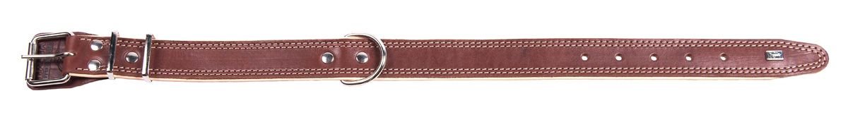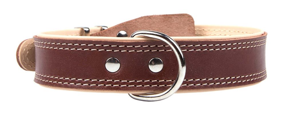 Трехслойный ошейник из натуральной кожи, края в загибку, проклеен и прошит декоративной строчкой, полукольцо посередине.