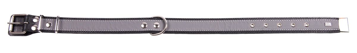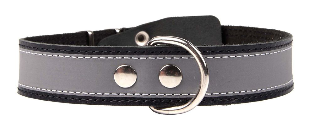 Однослойный ошейник из натуральной кожи со светоотражающей полосой, прошит декоративной строчкой, снабжен металлическим наконечником, отверстия укреплены металлической блочкой, полукольцо посередине.
