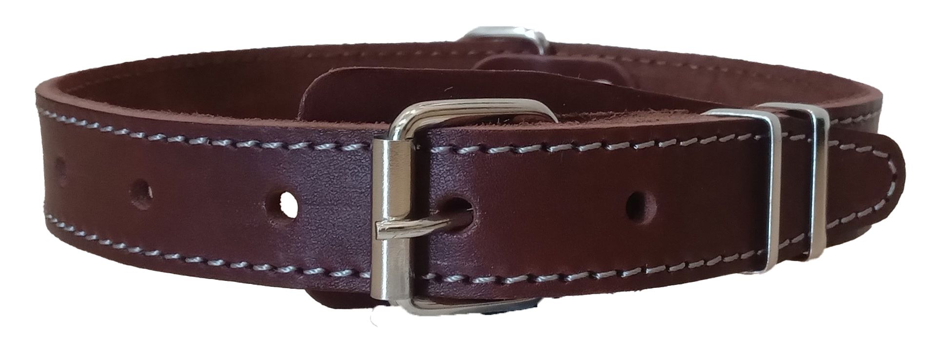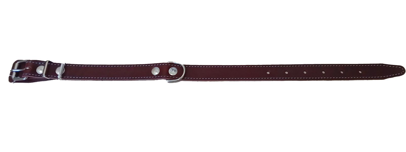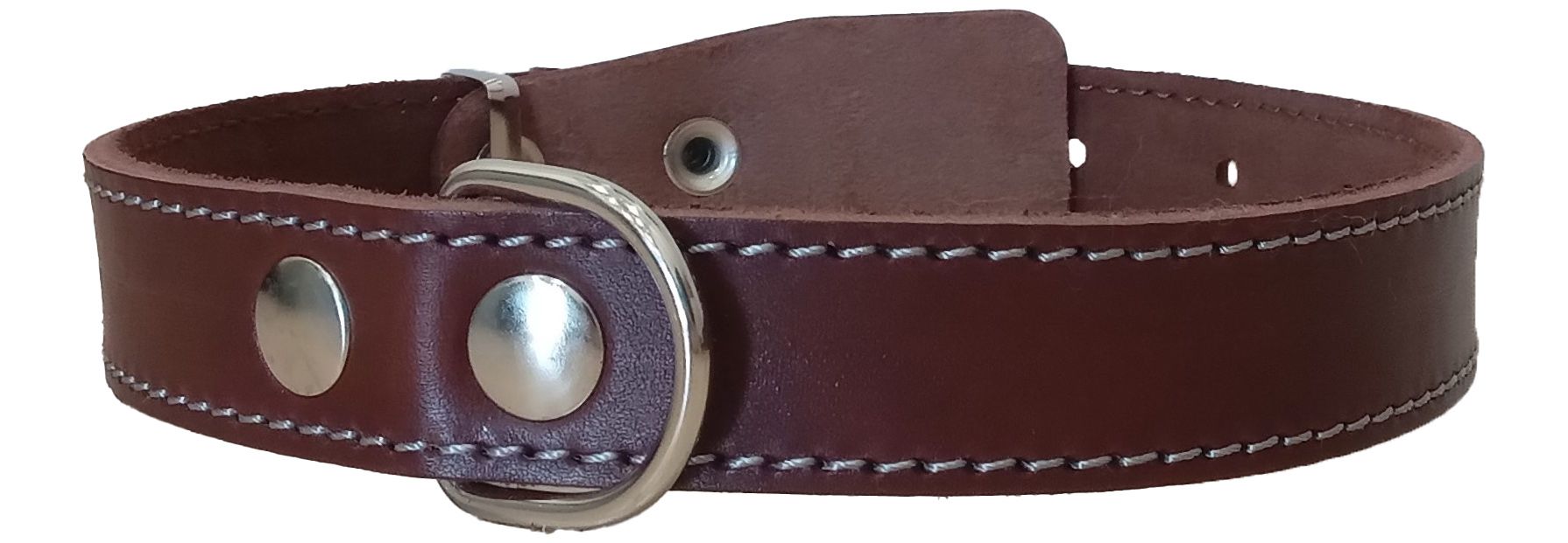 Однослойный ошейник из натуральной кожи, прошит декоративной строчкой, полукольцо посередине.