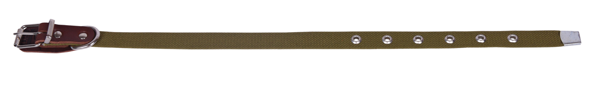Ошейник однослойный из брезентовой ленты ЛРТо. Материал - хлопок. Толщина (мм): 2,6 ± 0,3. Разрывная нагрузка: 140 кгс. Вставки под фурнитуру из натуральной кожи Отверстия укреплены металлической блочкой. Металлический или кожаный наконечник.
