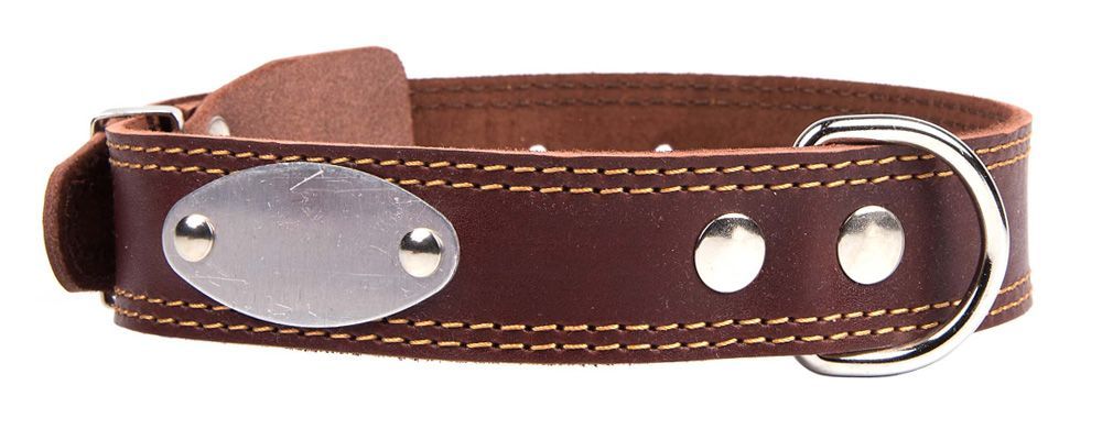 Однослойный ошейник из натуральной кожи с металлической адресной биркой, прошит декоративной строчкой, полукольцо посередине.