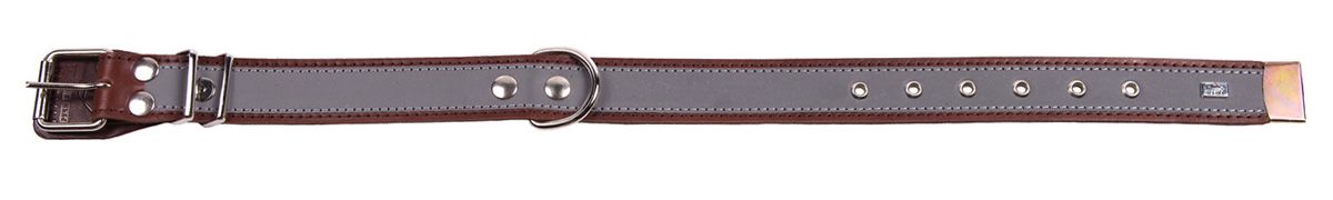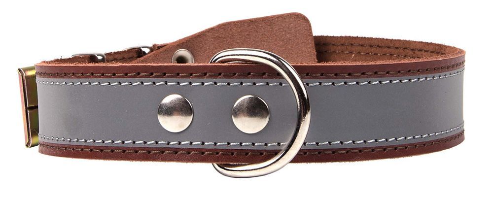 Однослойный ошейник из натуральной кожи со светоотражающей полосой, прошит декоративной строчкой, снабжен металлическим наконечником, отверстия укреплены металлической блочкой, полукольцо посередине.