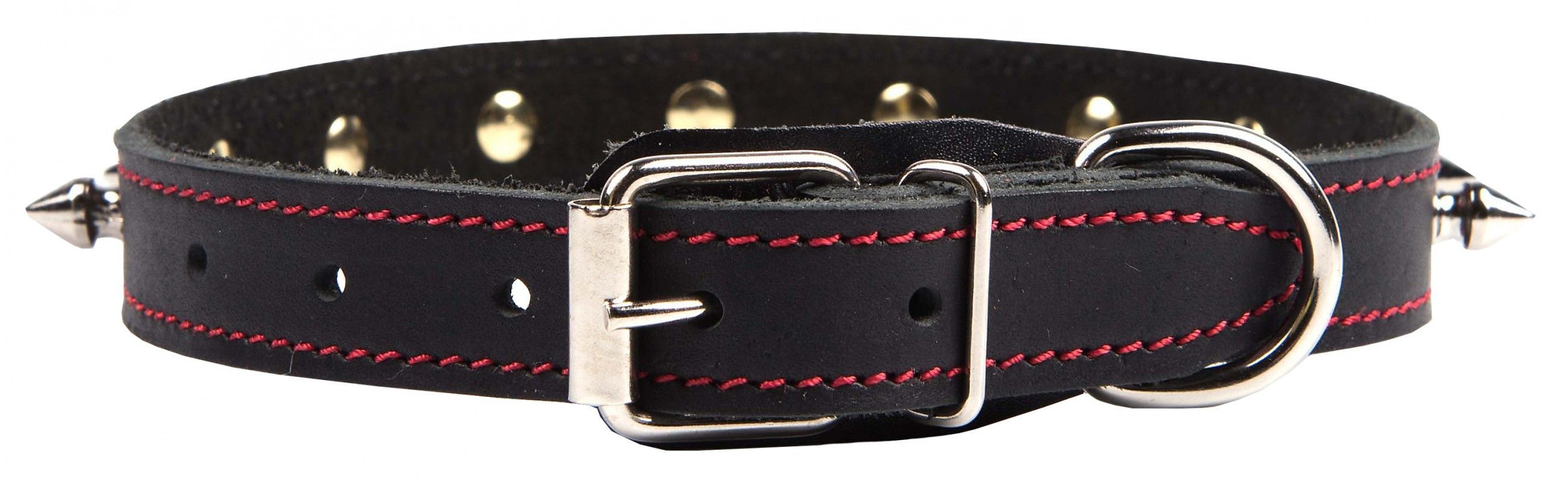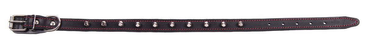 Однослойный ошейник из натуральной кожи, украшенный шипами, прошит декоративной строчкой, полукольцо у пряжки.