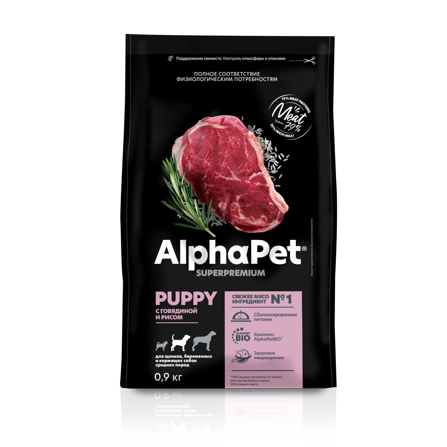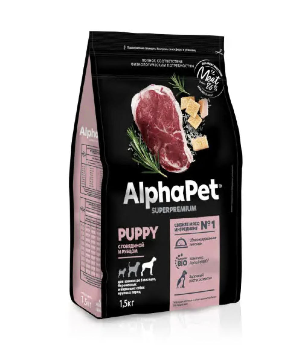 Корм для щенков до 6 месяцев, беременных и кормящих собак AlphaPet АльфаПет для крупных пород с говядиной и рубцом 1,5 кг сух. пакет**