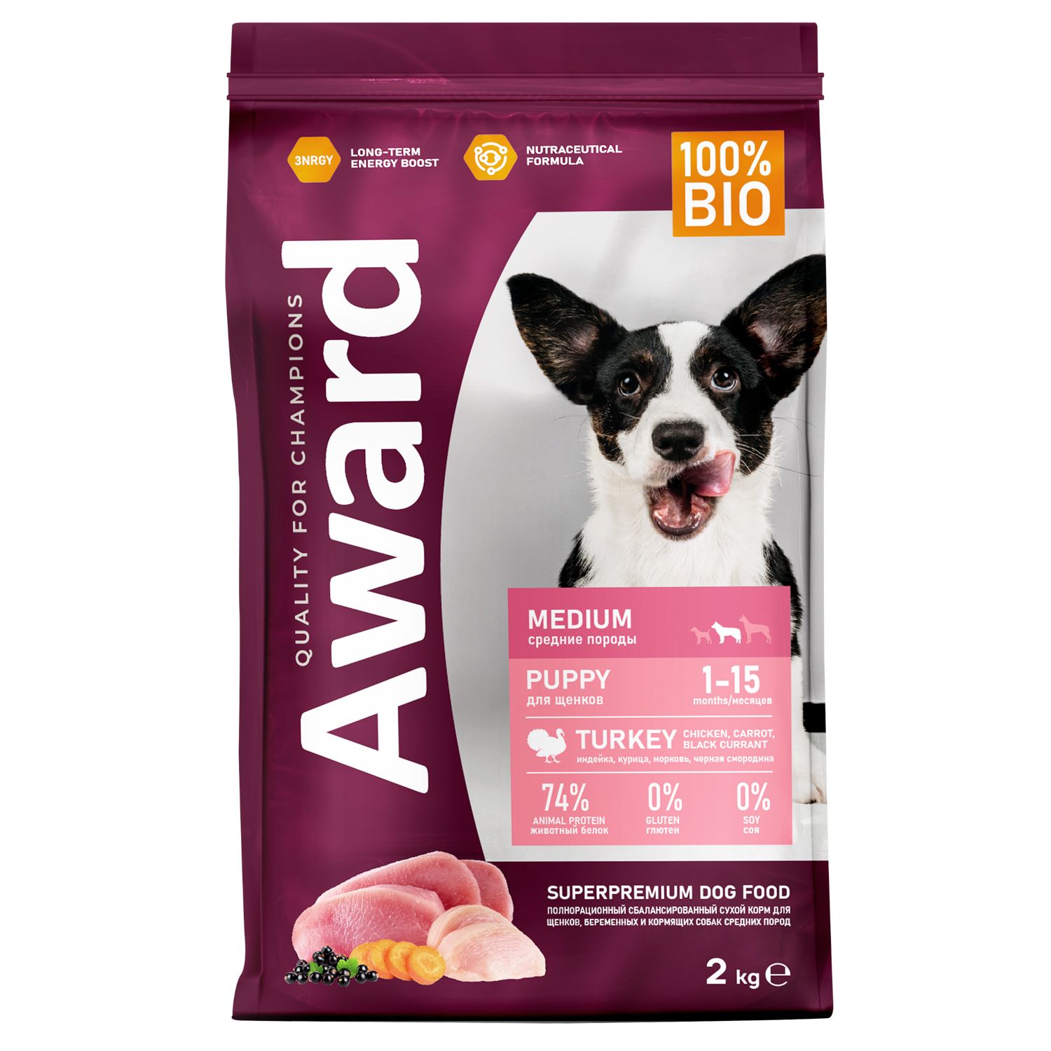 Корм для щенков AWARD Medium Эвард для средних пород от 1 месяца, беременных и кормящих сук с индейкой и курицей с добавлением моркови и черной смородины 2 кг сух. пакет**