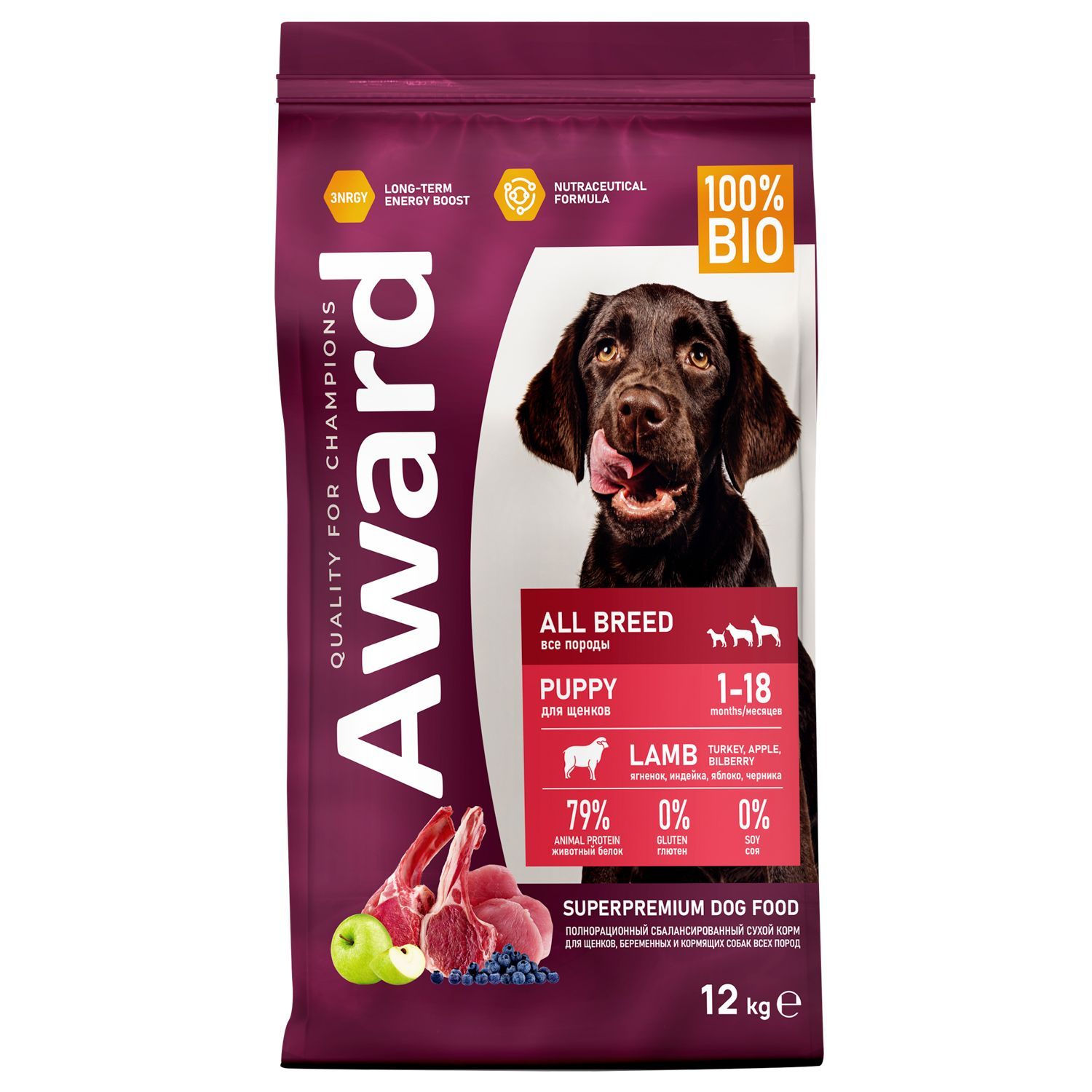 Корм для щенков от 1 месяца, беременных и кормящих сук AWARD Эвард с ягненком и индейкой с добавлением яблока и черники 12 кг сух. мешок**