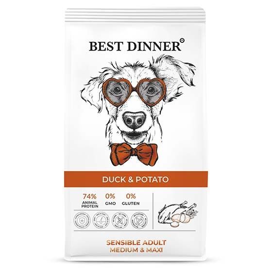 Полнорационный корм супер-премиум класса для собак средних и крупных пород Best Dinner с уткой и картофелем без добавления мяса курицы создан специально для собак с особыми потребностями.