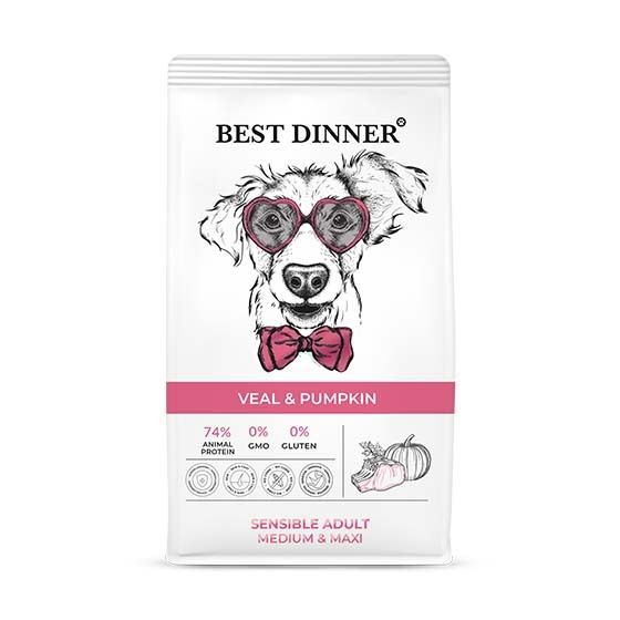 Высококачественный полнорационный корм для собак средних и крупных пород Best Dinner с телятиной и тыквой создан специально для собак с особыми потребностями. Вкусная телятина с добавлением индейки понравится даже самым привередливым питомцам. Корень цикория способствует росту полезной кишечной микрофлоры и улучшению усвояемости корма. Тыква, это отличный источник всех необходимых витаминов и клетчатки, который отлично подходит для животных с чувствительным пищеварением.