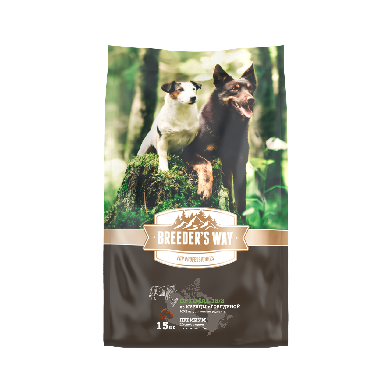 Полнорационный сухой корм для взрослых собак Breeder's way Optimal 18/8, из курицы с говядиной.