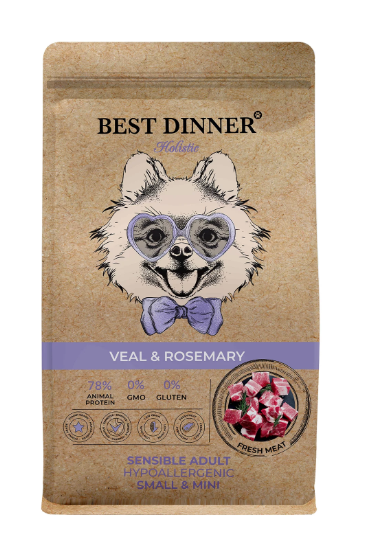 Полнорационный гипоаллергенный корм Best Dinner Holistic с телятиной и розмарином создан специально для собак с особыми потребностями.