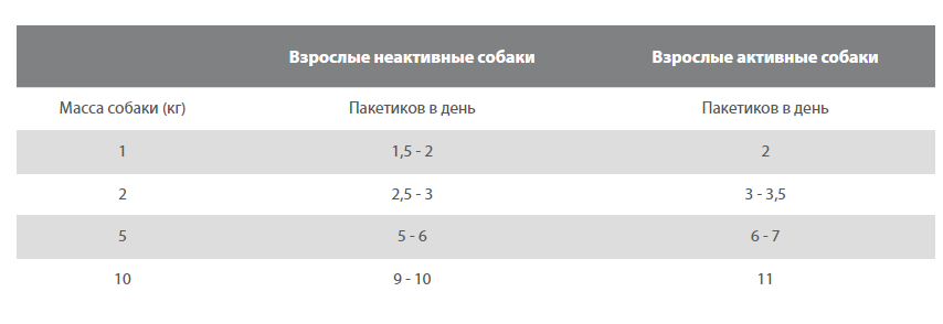 Рекомендации по кормлению: используйте таблицу для определения суточной нормы кормления вашей собаки. Указанные нормы рекомендованы для поддержания собаки в оптимальной физической форме. Суточное количество корма может быть разделено на два и более кормлений. Всегда оставляйте миску с водой в течение дня.