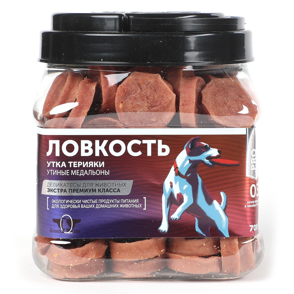 Вкусное и полезное лакомство для собак всех пород для развития ловкости в виде сушеных утиных медальонов.