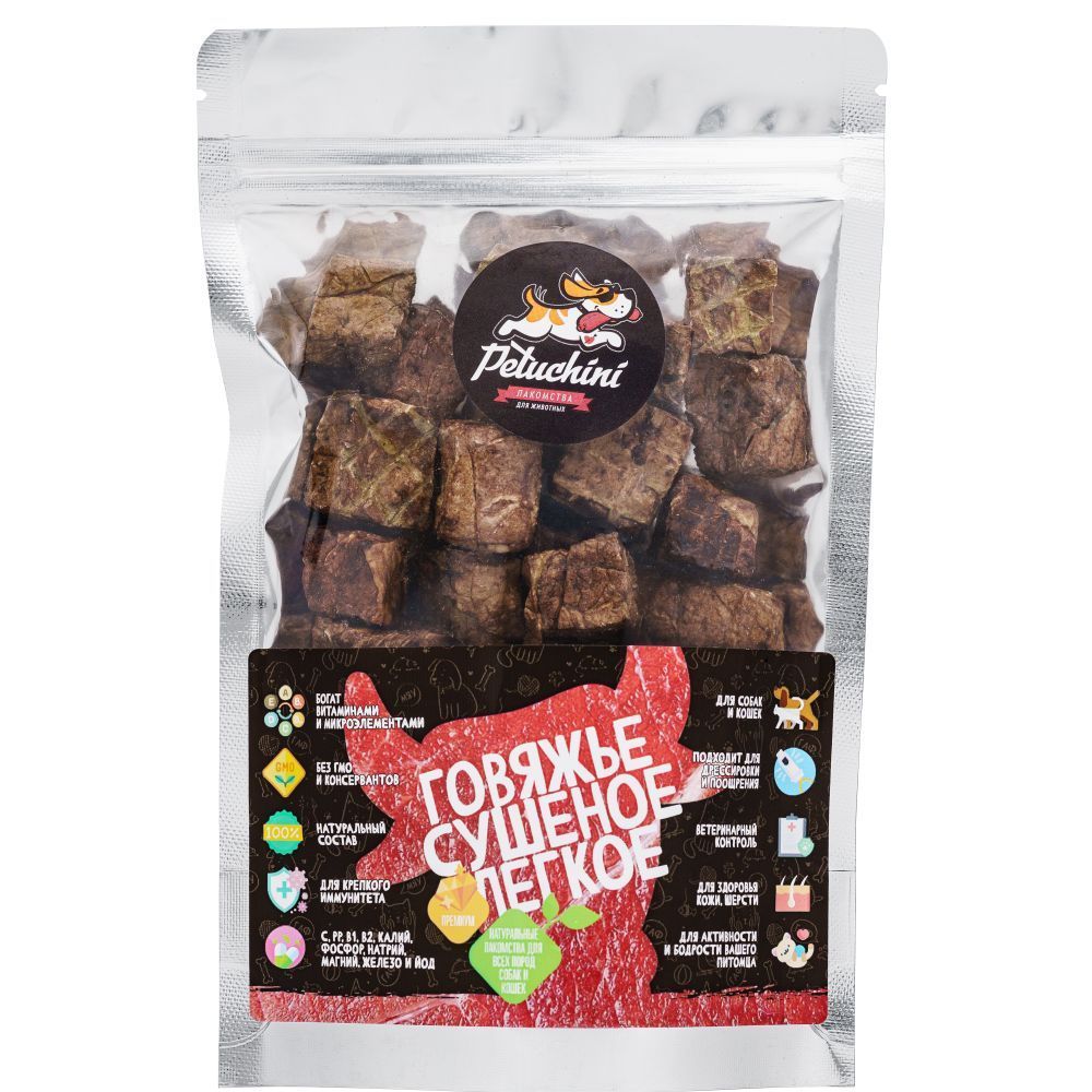 Уникальное лакомство — Говяжье лёгкое для собак и кошек Петучини. Это сушёное лакомство станет настоящим угощением для ваших питомцев. Оно приготовлено из натурального говяжьего мяса, что делает его вкусным и полезным для животных.