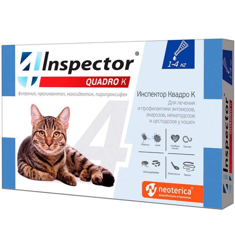 Инспектор Квадро К назначают кошкам для лечения ипрофилактики энтомозов, отодектоза, нотоэдроза, акарозов, вызываемых иксодовыми клещами, нематодозов желудочно-кишечного тракта (токсокароз, токсаскаридоз, унцинариоз, анкилостомоз), цестодозов (тениидозы, дипилидиоз, альвеококкоз, мезоцестоидоз, дифиллоботриоз), а также в целях профилактики дирофиляриоза.